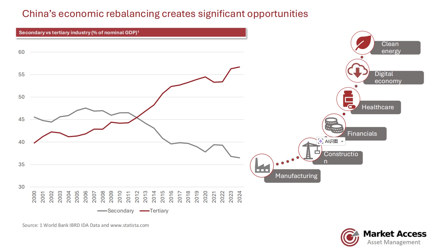 - Economic transformation in China is seeing an ongoing shift from industry to services, and also from construction and related sectors to higher end manufacturing subsectors like car and train production and computer and telecommunications equipment